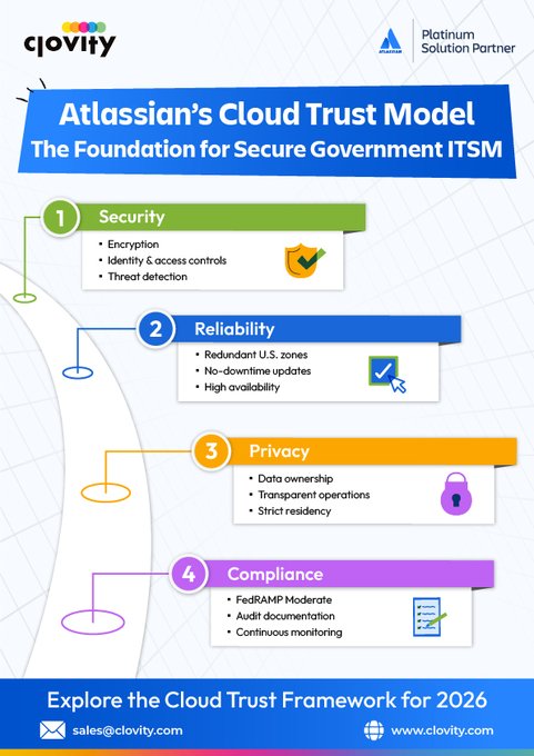 @ClovityInc Understanding the Cloud Trust Model for Government ITSM Secure, reliable and compliant cloud operations start with a strong foundation. Atlassian’s Cloud Trust Model breaks it down into four key pillars that every agency should consider for 2026 readiness. Here’s whateIRa