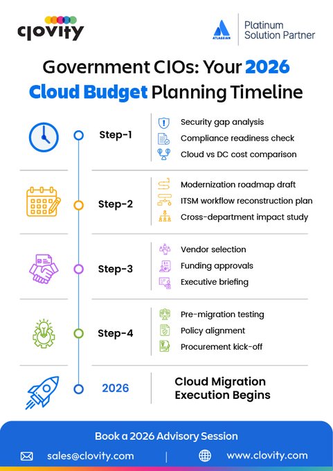 @ClovityInc Government CIOs: early planning is the key to avoiding costly surprises during cloud modernization. Our 2026 Cloud Budget Planning Timeline gives agencies a clear roadmap to align security, compliance and funding well before migration begins. Here’s what the timeline covers: VZI4